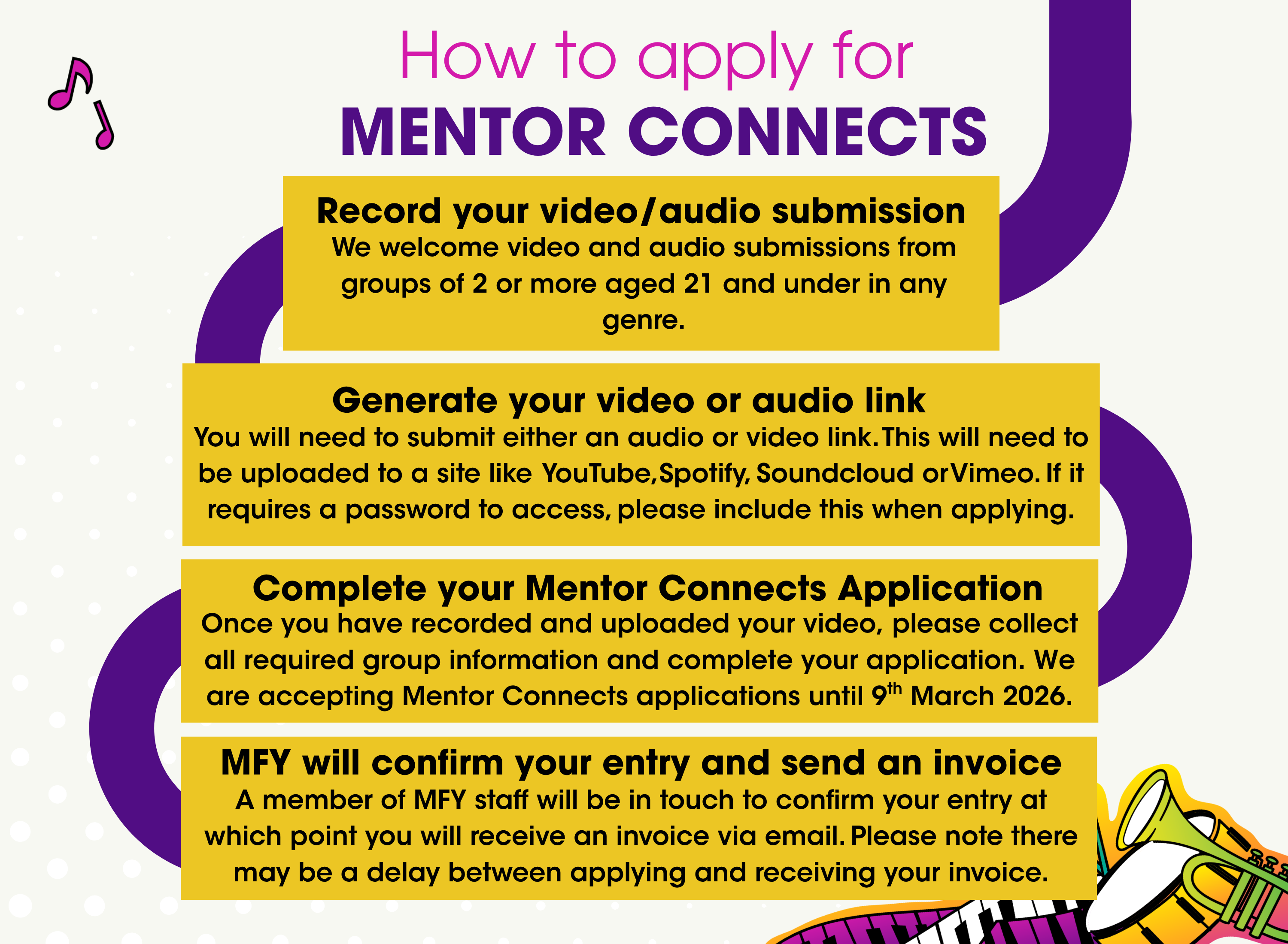 If you cannot attend a Music for Youth Regional Festival, you can submit a recording to our online Mentor Connects platform. We will be accepting Mentor Connects applications until Monday 9th March 2026.